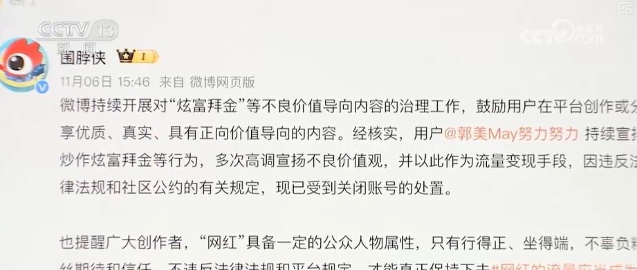 近日,兩名網紅賬號接連被封禁,引發社會關注。11月6日,微博官方賬號發文稱,用戶“郭美May努力努力”持續炒作炫富拜金等行為,多次高調宣揚不良價值觀,并以此作為流量變現手段,因違反法律法規和社區公約的有關規定,受到關閉賬號的處置。