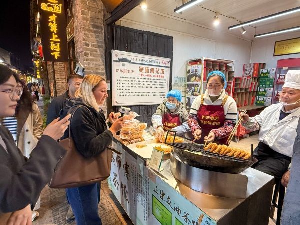 當(dāng)夜幕降臨,悠悠畫舫穿過六百年清江大閘,里運河的槳聲燈影里,璀璨夜市徐徐鋪展。海外視頻博主們直奔里運河文化長廊、河下古鎮(zhèn),乘游船、賞夜景,體驗當(dāng)?shù)孛袼罪L(fēng)情。
