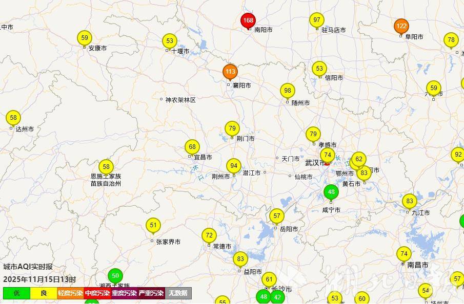 11月13日下午到夜間起,受上游污染傳輸滯留和本地不利氣象條件下的污染積累影響,襄陽、荊門、荊州、隨州小時濃度明顯升高;昨日(14日),轉靜穩態,荊門、襄陽日均輕度污染;截至15日13時,襄陽為輕度污染,其余城市以良為主。