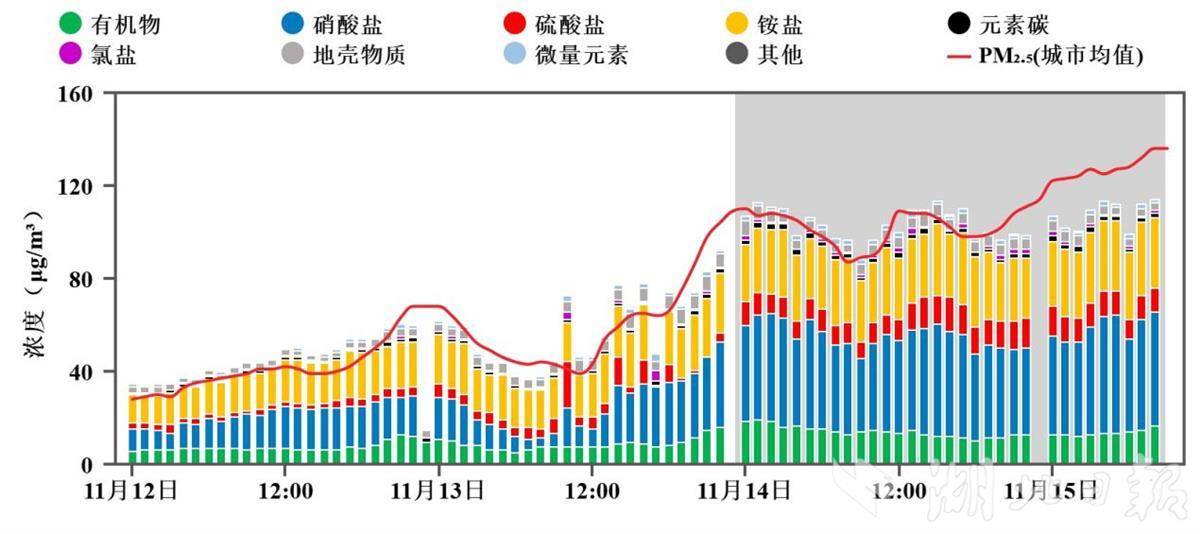11月12日0時至15日8時襄陽市超級站組分重構與PM2.5濃度值變化。