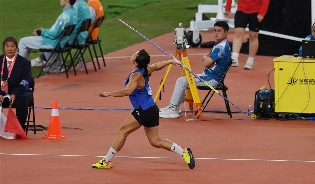 決賽共有12名選手參賽,來自全國各地的頂尖選手展開激烈角逐,其中湖北隊蘇玲丹、呂會會與浙江隊戴倩倩形成三足鼎立之勢。蘇玲丹第一輪就投出62米42,鎖定全場最好成績。隨后,她全程保持穩定發揮,憑借爆發力強、助跑節奏穩定的技術特點,多次投出60米以上的優異成績。