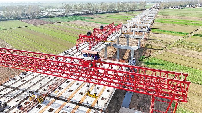 據了解,目前在新港特大橋全段,已打下807根樁基,336片梁板預制任務超額完成。架梁現場,通過跨墩龍門吊提梁,正以每日5片的架設速度穩步推進。