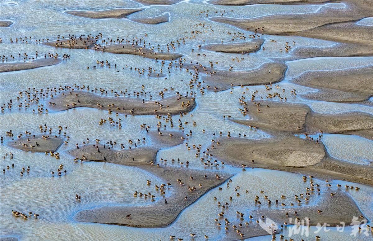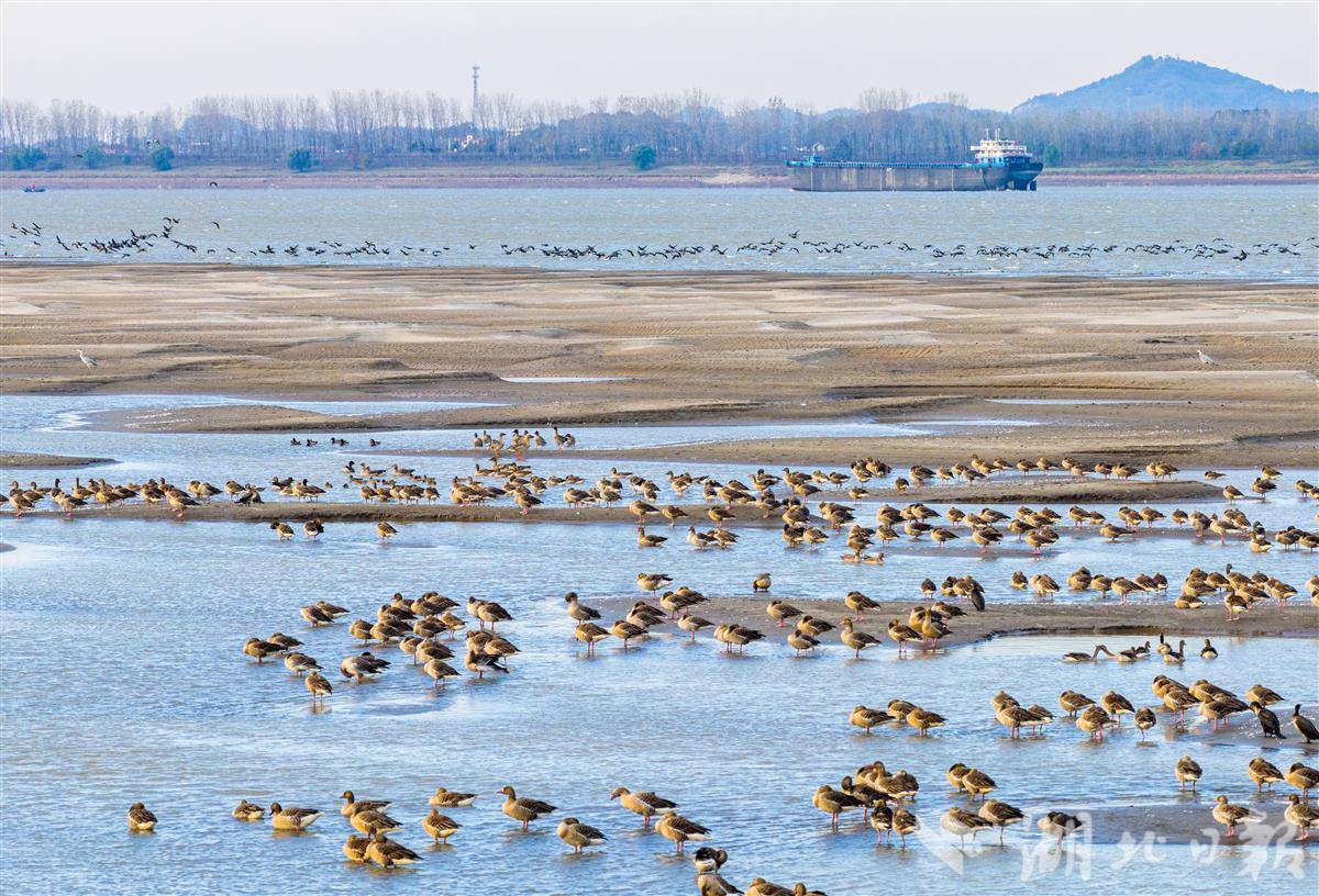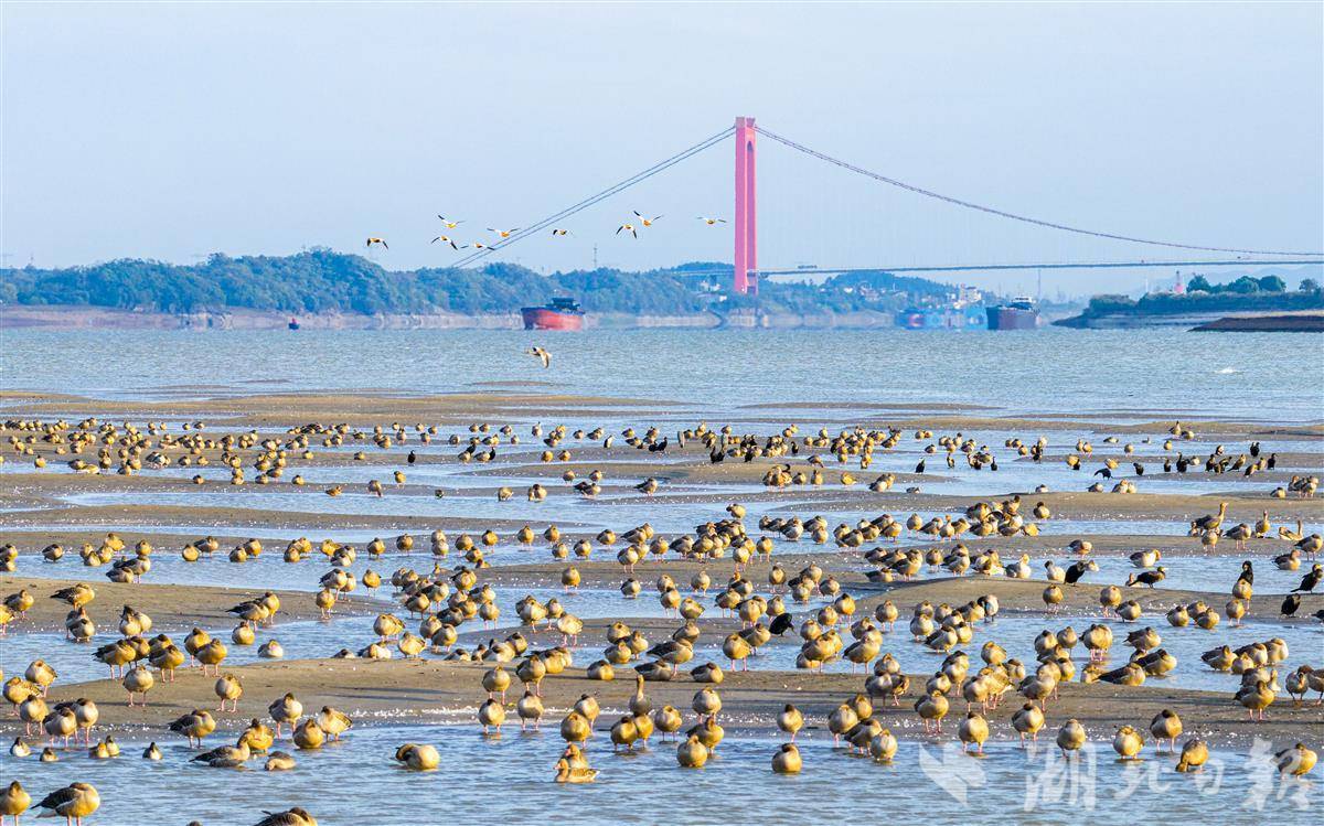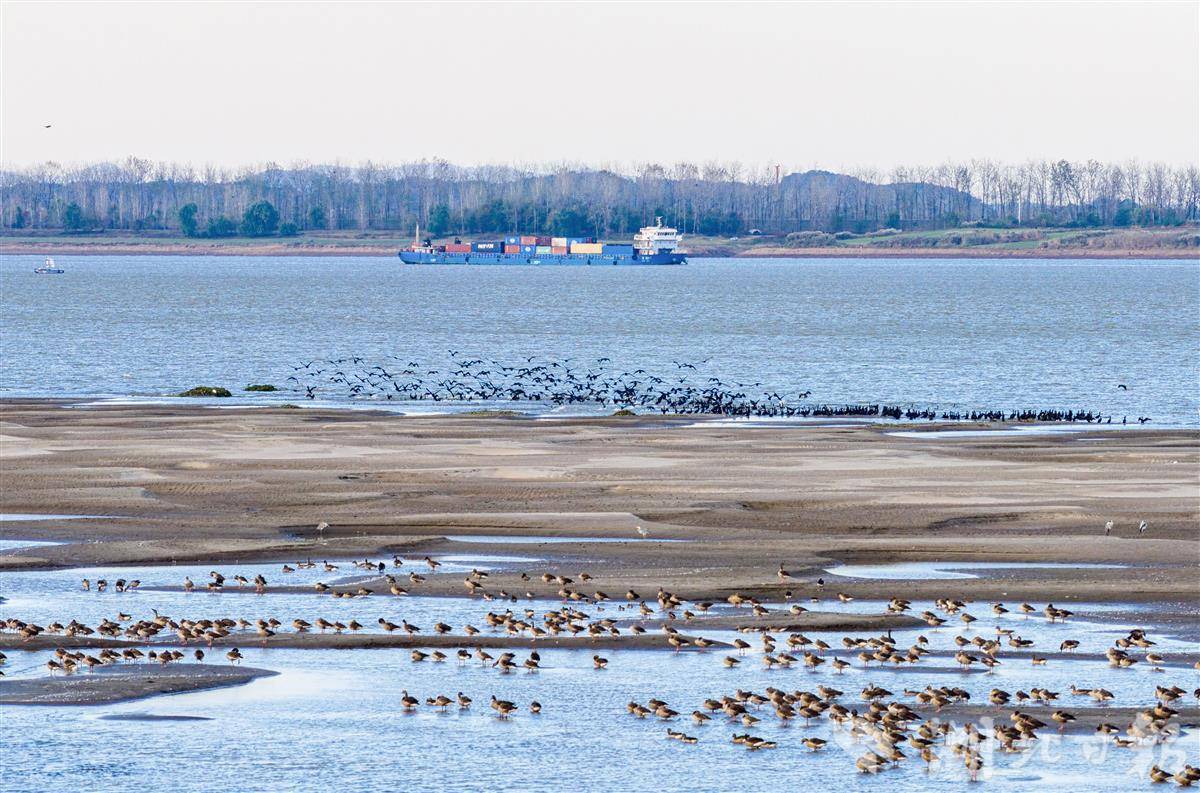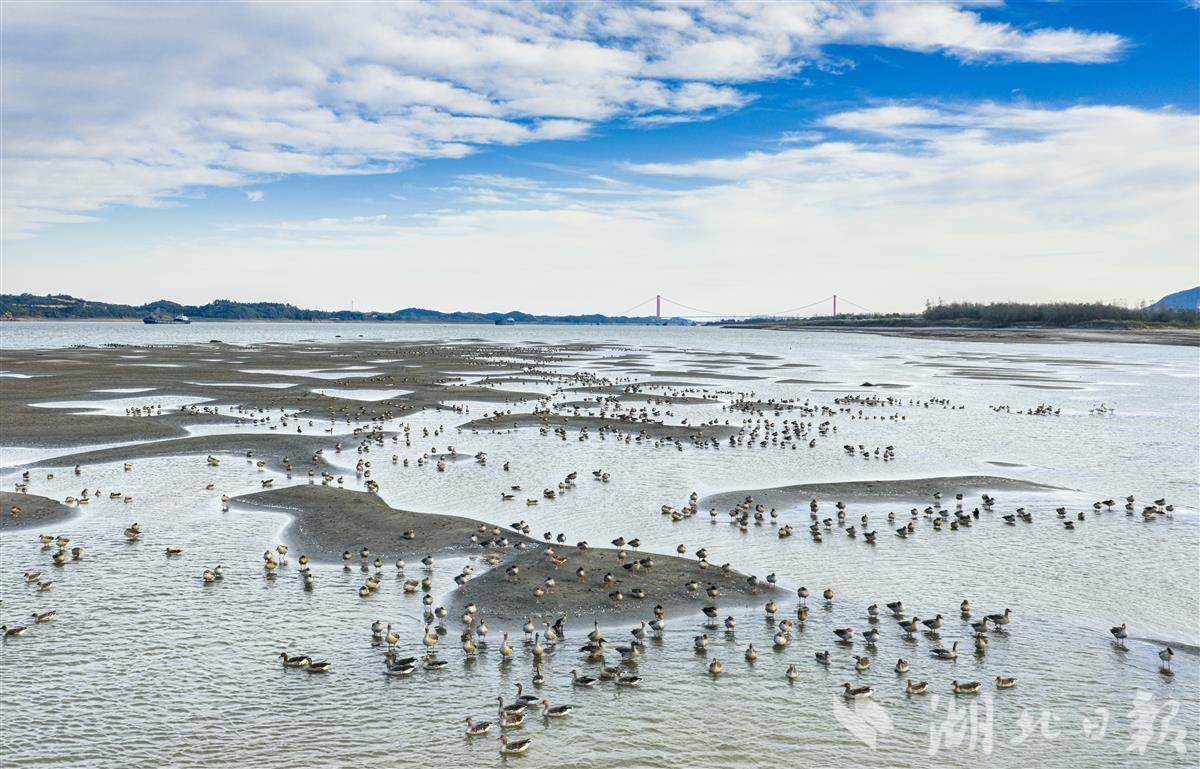 11月20日,在長江黃石段,成群候鳥在江面上覓食嬉戲,構成一幅美妙的冬日畫卷。