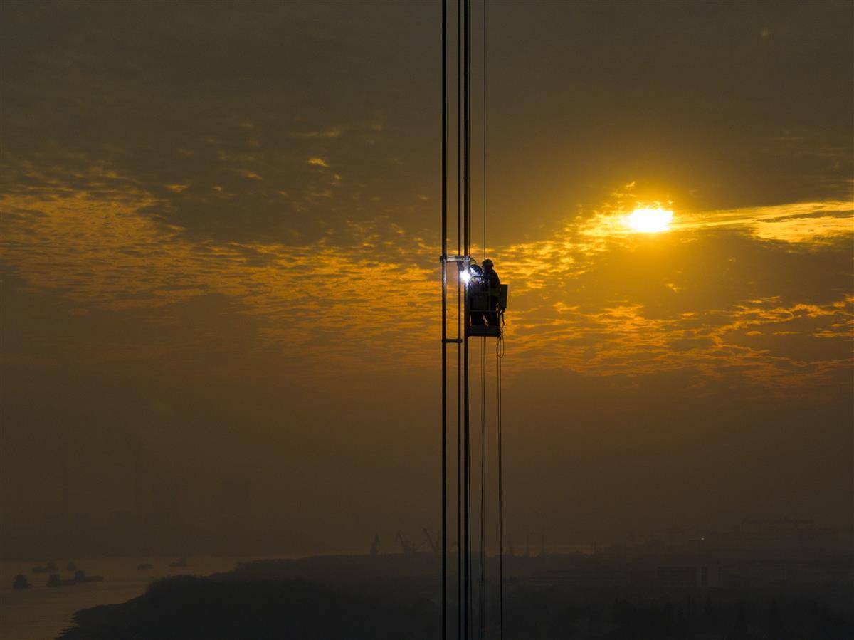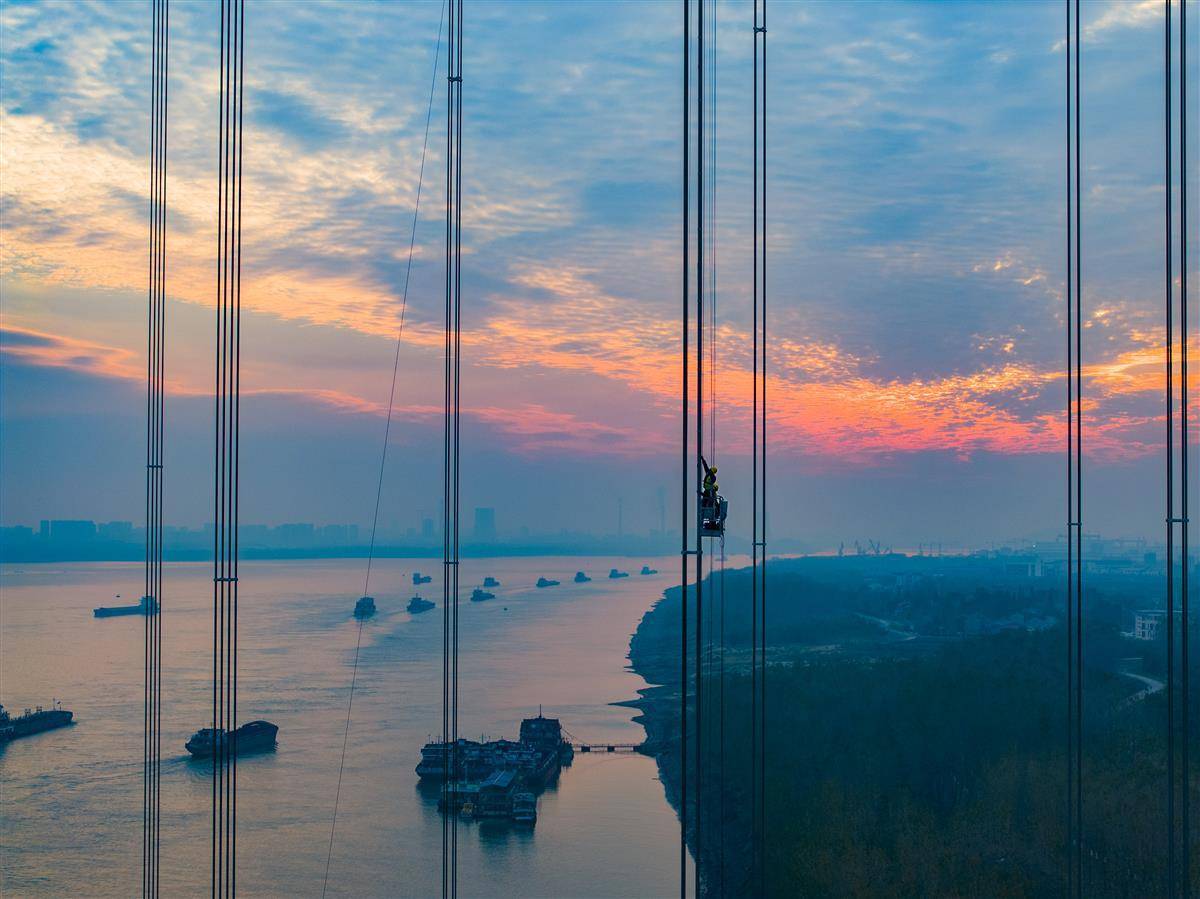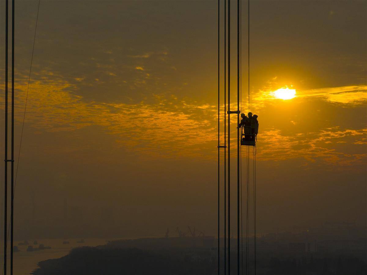 11月20日傍晚,武漢雙柳長江大橋北岸橋面上空,建設者正在安裝吊索減振架。