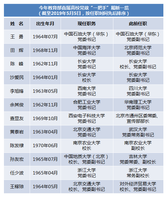 據統計,包括8名黨委書記和4名校長在內,今年至少已有10所教育部直屬高校黨政“一把手”調整,其中北京交通大學和長安大學的黨委書記、校長崗位今年都迎來了新人。