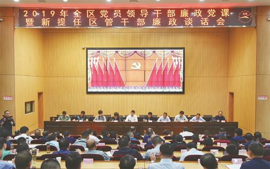 圖為:5月30日,新洲區(qū)委書記趙利洪講廉政黨課,對全區(qū)各單位主要負責人、新提拔干部開展集中廉政談話。