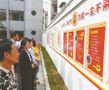 圖為:新洲區(qū)邾城街廉政文化長廊引人駐足觀看。