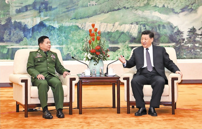習(xí)近平說,中緬軍事合作是兩國全面戰(zhàn)略合作伙伴關(guān)系的重要組成部分。兩軍要深化務(wù)實交流合作,共同打造基于互信互利、并致力于維護兩國共同安全和發(fā)展利益的兩軍關(guān)系。