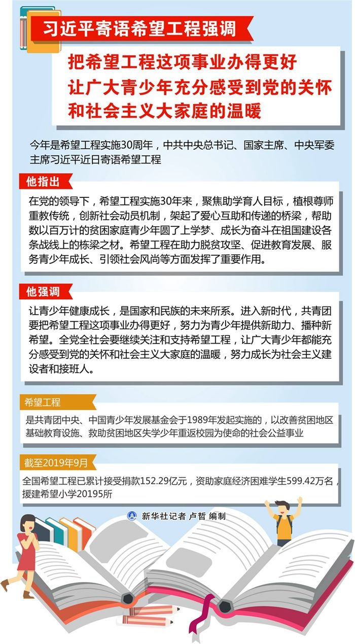 新華社北京11月20日電 今年是希望工程實施30周年,中共中央總書記、國家主席、中央軍委主席習近平近日寄語希望工程。他指出,在黨的領導下,希望工程實施30年來,聚焦助學育人目標,植根尊師重教傳統,創新社會動員機制,架起了愛心互助和傳遞的橋梁,幫助數以百萬計的貧困家庭青少年圓了上學夢、成長為奮斗在祖國建設各條戰線上的棟梁之材。希望工程在助力脫貧攻堅、促進教育發展、服務青少年成長、引領社會風尚等方面發揮了重要作用。