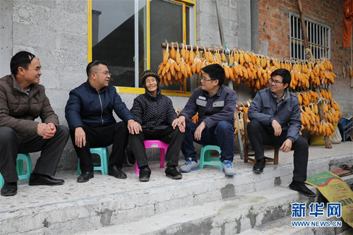 南方電網南寧供電局駐村扶貧第一書記黃建敏(右二)、“70后”扶貧村干部黃周瑜(左二)與村民一塊商量2019年發展計劃(1月17日攝)。新華社記者 何豐倫 攝