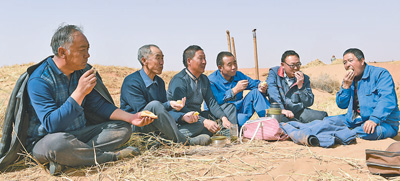 3月26日,在甘肅省古浪縣境內的黑崗沙風沙口,八步沙第二代治沙人賀中強(左一)、郭萬剛(左二)、石銀山(左三)、羅興全(右三)、程生學(右二)、王志鵬(右一)在休息間隙吃午飯。