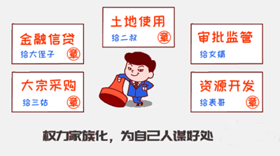 有的領導干部利用手中的權力給家族成員開公司、接項目提供便利,或者封官許愿,可謂一人當官,全家受益。