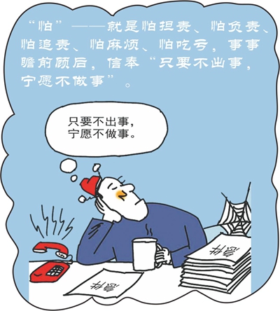 怕擔責、怕負責、怕追責、怕麻煩、怕吃虧,事事瞻前顧后,信奉“只要不出事,寧愿不做事”。