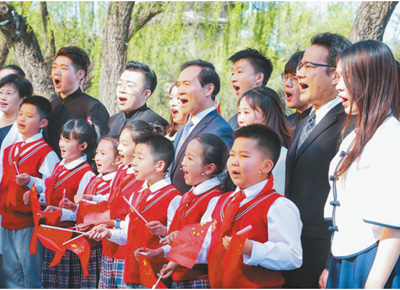 北京大學教師與北京大學合唱團、北大附小的同學們共同唱響《歌唱祖國》。
