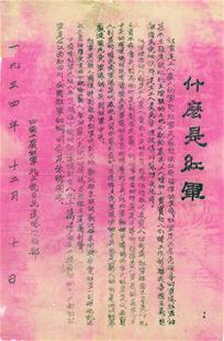 這是一張彌足珍貴的傳單(圖一)。1934年12月10日,紅二十五軍以“中國工農(nóng)紅軍北上抗日先遣隊(duì)政治部”名義印發(fā)手寫油印品《什么是紅軍》,短短15行404字,言簡意賅地宣傳了中國工農(nóng)紅軍的性質(zhì)、主張、組成、任務(wù)和有關(guān)政策。
