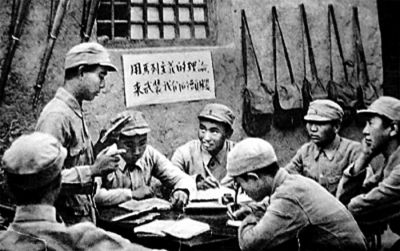在整風運動中,共產黨采用強化教育、小組學習、批評與自我批評和思想改造等方法,來建造一個在思想、組織和作風等方面都一致的統一政黨。圖為八路軍指戰員在整風運動中認真學習馬列主義理論。