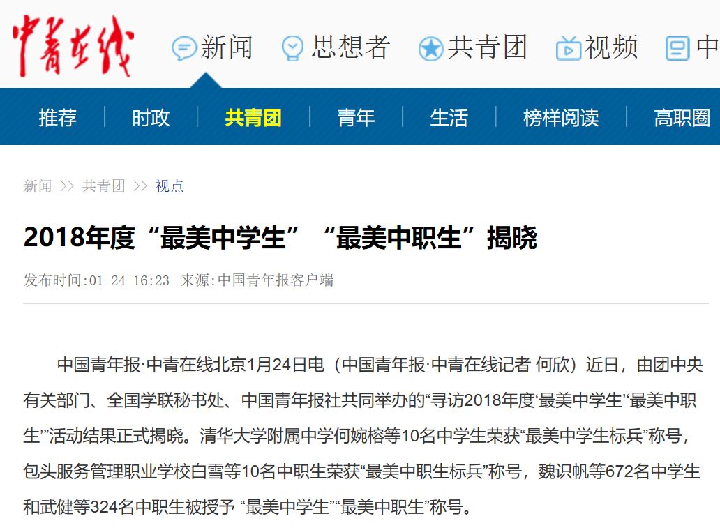 近日,由團中央學校部、全國學聯秘書處、中國青年報共同舉辦的“尋訪2018年度‘最美中學生’‘最美中職生’”活動結果正式揭曉。