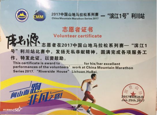 2.2017年中國山地馬拉松利川站優秀志愿者(中國登山協會)