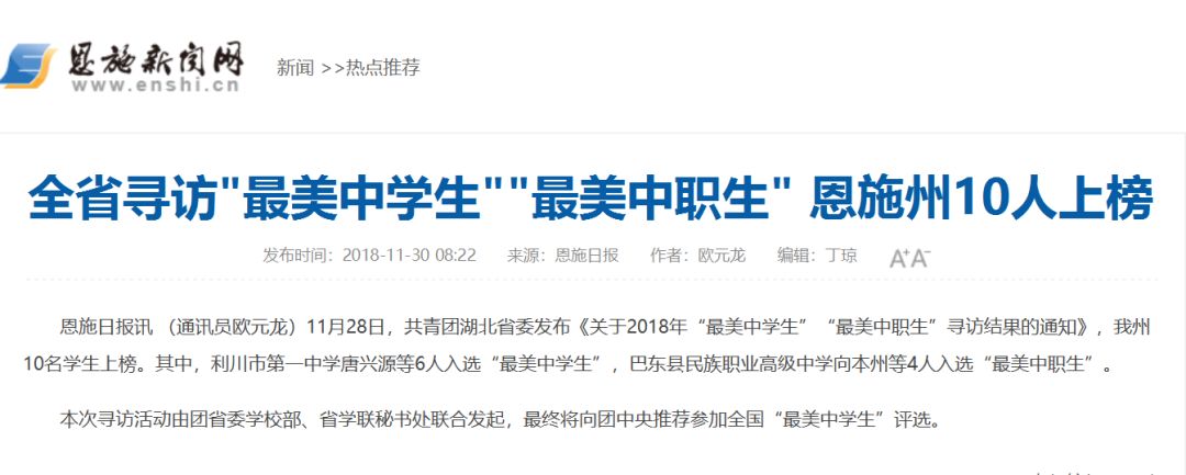 2018年11月28日,湖北省在恩施地區共評選出6名省級“最美中學生”,并向團中央進行推薦參加全國“最美中學生”評選,僅利川一中唐興源同學一人脫穎而出,光榮上榜。