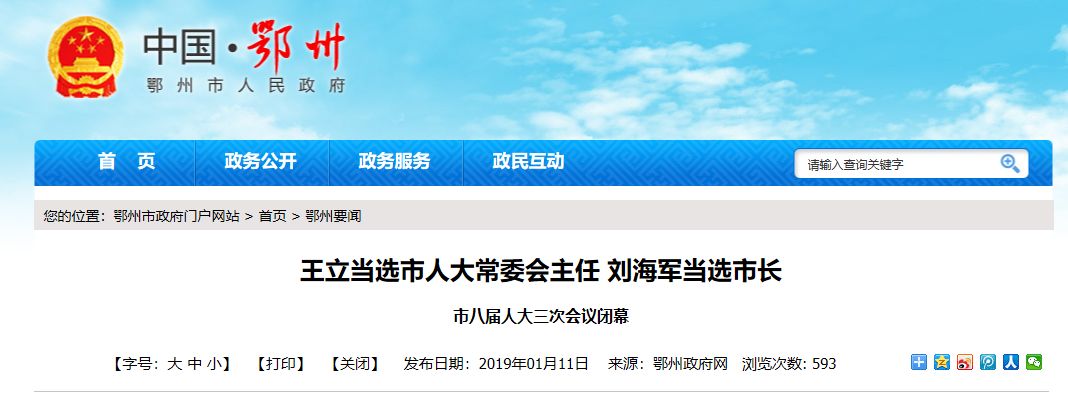1月10日,鄂州市八屆人大三次會議閉幕,王立當選市人大常委會主任,劉海軍當選市長。