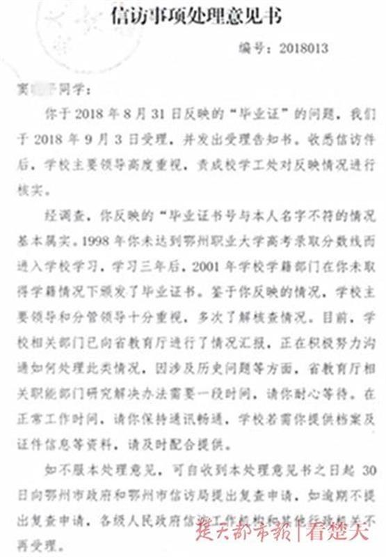 在與校方溝通未果后,去年8月份,竇先生前往湖北省檔案館查詢當年鄂州大學招生的學生花名冊,也沒有找到自己的名字。為此,竇先生向省有關部門進行了投訴,隨后在去年10月份,鄂州職業大學學工處進行了回復,稱“省教育廳相關職能部門正在研究解決辦法,需要一段時間。”讓其耐心等候。