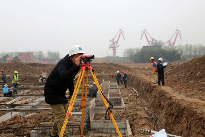 三江港綜合碼頭1-4號泊位陸域堆場正在抓緊建設中,計劃今年完成陸域堆場、供電通信工程建設,實現(xiàn)開港運營。 日前,工程技術人員正在施工現(xiàn)場測量標高。