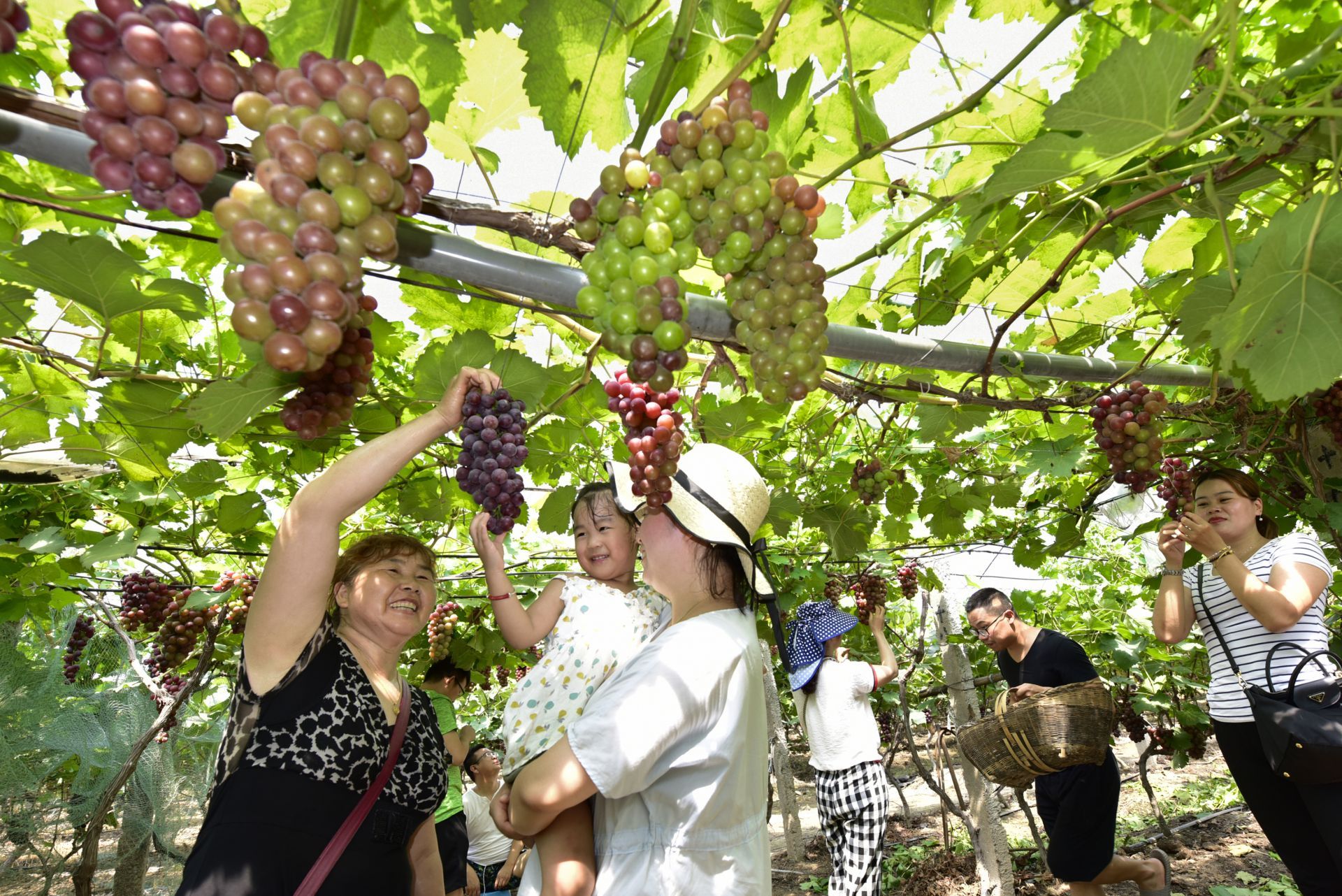 8月3日,游客在杜山鎮(zhèn)路口村順喜葡萄采摘園內(nèi)摘葡萄。該園近年堅(jiān)持采用有機(jī)葡萄標(biāo)準(zhǔn)種植,每到園內(nèi)種植的無(wú)核夏黑、陽(yáng)光玫瑰、醉金香等葡萄成熟時(shí),都會(huì)吸引鄂州及武漢、黃岡、黃石等周邊城市的游客前來(lái)體驗(yàn)采摘游玩的快樂(lè)。僅去年吸引的游客就達(dá)1萬(wàn)人(次)以上,并輻射帶動(dòng)周邊10多戶困難群眾就業(yè)。