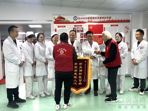 荊楚網(湖北日報網)訊(通訊員 周寧欣)12月11日,在鄂州市中醫醫院針灸科上演了溫情一幕——“鄂州楷模”祝光賢先生將錦旗送到科室,為主任周海旺、副主任宋宏文、護士長王麗等醫護人員念了一封感謝信。