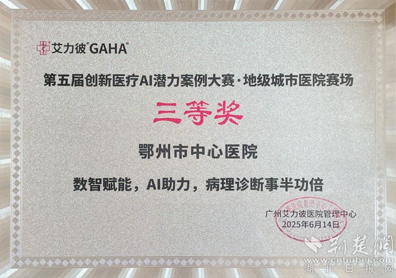 荊楚網(湖北日報網)訊(通訊員 張雪芳)6月14日,湖北省鄂州市中心醫院病理科在全國第五屆創新醫療 AI 潛力案例大賽中榮獲“地級城市醫院賽場三等獎”。