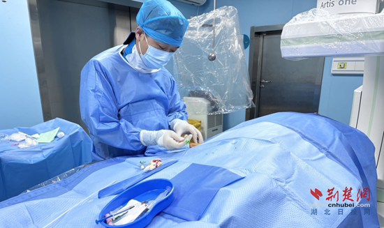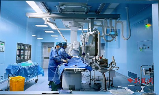 臨空院區(qū)由副主任醫(yī)師皮強(qiáng)峰迅速完成患者的術(shù)前評(píng)估,直達(dá)介入室。明堂院區(qū)由副主任醫(yī)師朱金洲負(fù)責(zé),同步為患者做好了手術(shù)準(zhǔn)備。兩院區(qū)介入室各項(xiàng)工作有條不紊、緊張高效地同步進(jìn)行。