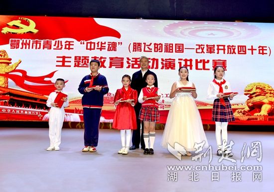 鄂州市關工委舉辦全市青少年”中華魂 “主題教育活動演講比賽。圖為市關工委主任姜昭定(左四)為獲得中華魂演講比賽一等獎選手頒獎。通訊員供圖