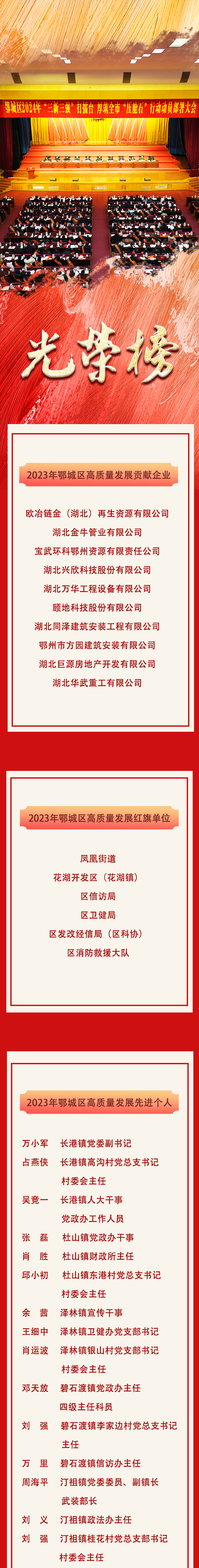 2月21日,鄂城區(qū)召開2024年“三新三強(qiáng)”打擂臺(tái) 厚筑全市“壓艙石”行動(dòng)動(dòng)員部署大會(huì)。通報(bào)表揚(yáng)了2023年度全區(qū)高質(zhì)量發(fā)展綜合考評(píng)先進(jìn)集體和先進(jìn)個(gè)人,歐冶鏈金等10家企業(yè)、鳳凰街道等6家單位、萬小軍等80名同志光榮上榜。