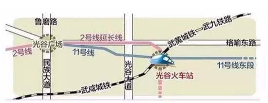建成的光谷火車站,將匯聚地鐵11號線、2號線南延線,武黃、武咸2條城鐵線,武漢九鐵路和雄楚大街BRT專用公交線路,成為集國鐵、城鐵、地鐵和BRT公交于一體的大型綜合交通樞紐站。
