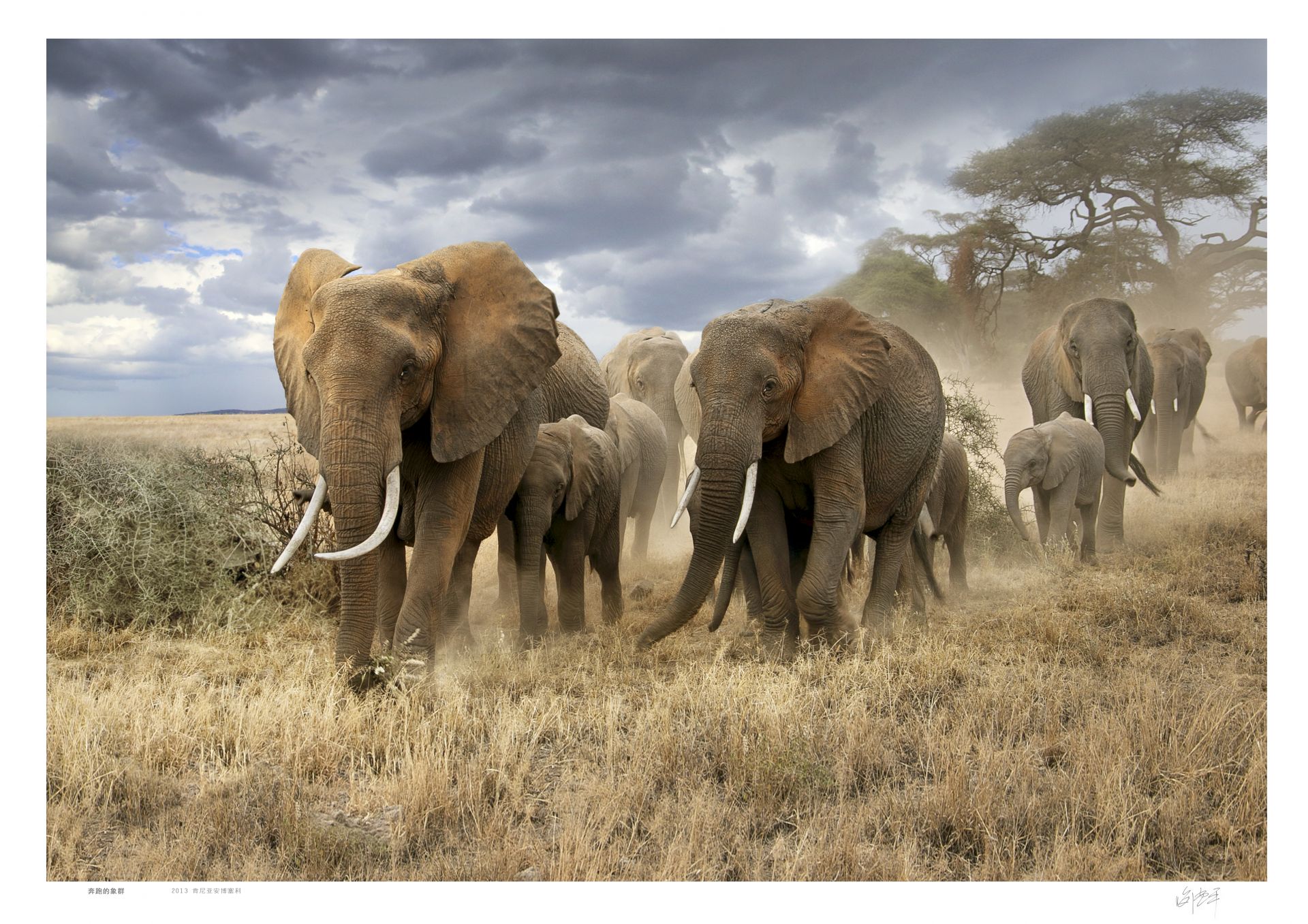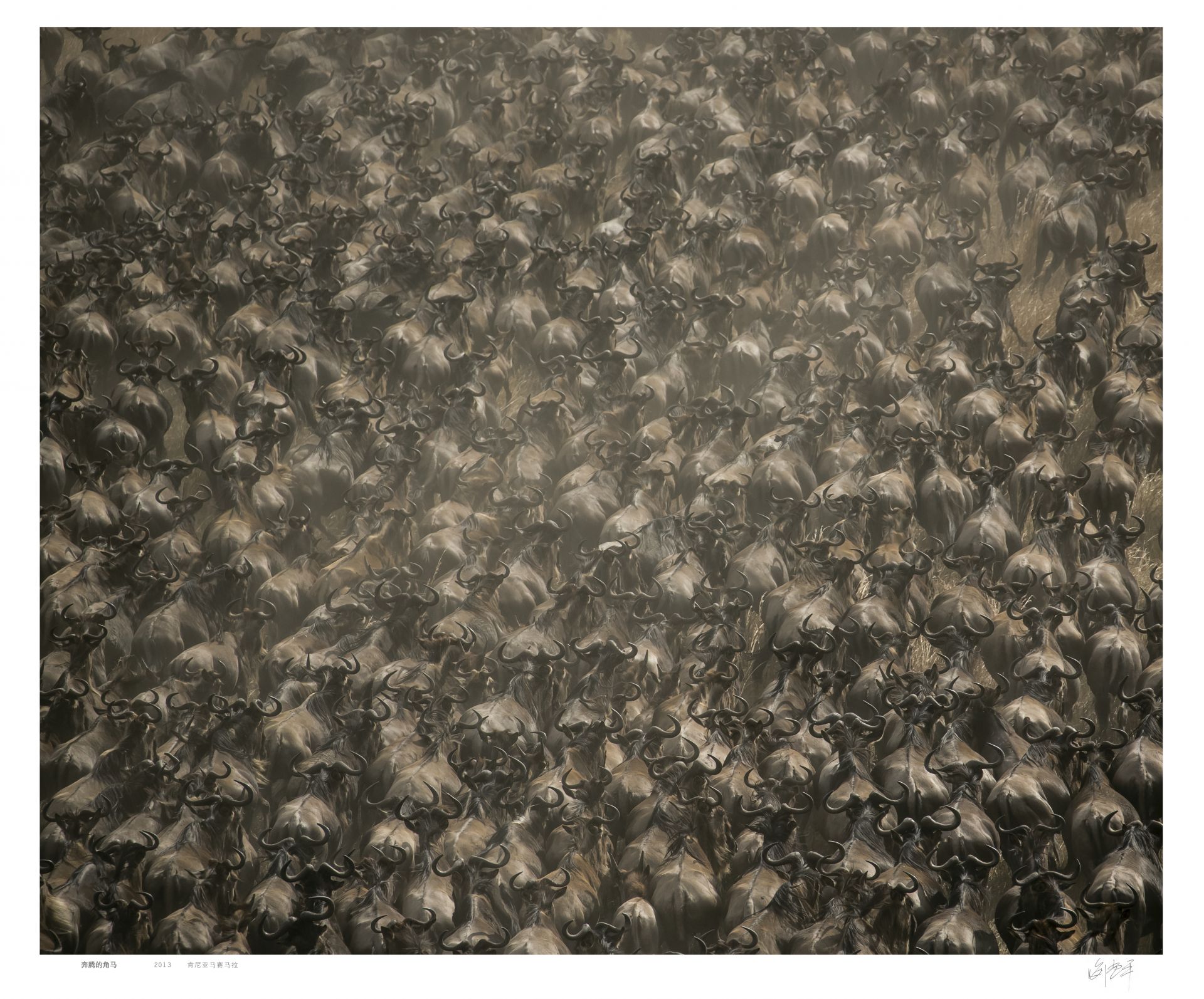 旱季,大群角馬在遷徒中穿越馬賽馬拉自然保護區。它們所到之處,草被吃光,奔跑時塵土飛揚,好不壯觀。我乘座的直升機剛升空2分鐘,發現遠處黃色的草原上一片黑色伴隨著飛揚的塵土在快速移動,立即飛往上空,用300mm焦距鏡頭拉近角馬群,用滿構圖的方式,讓奔騰的動物有沖出畫面之感,在快速的運動中拍下這一瞬間。
