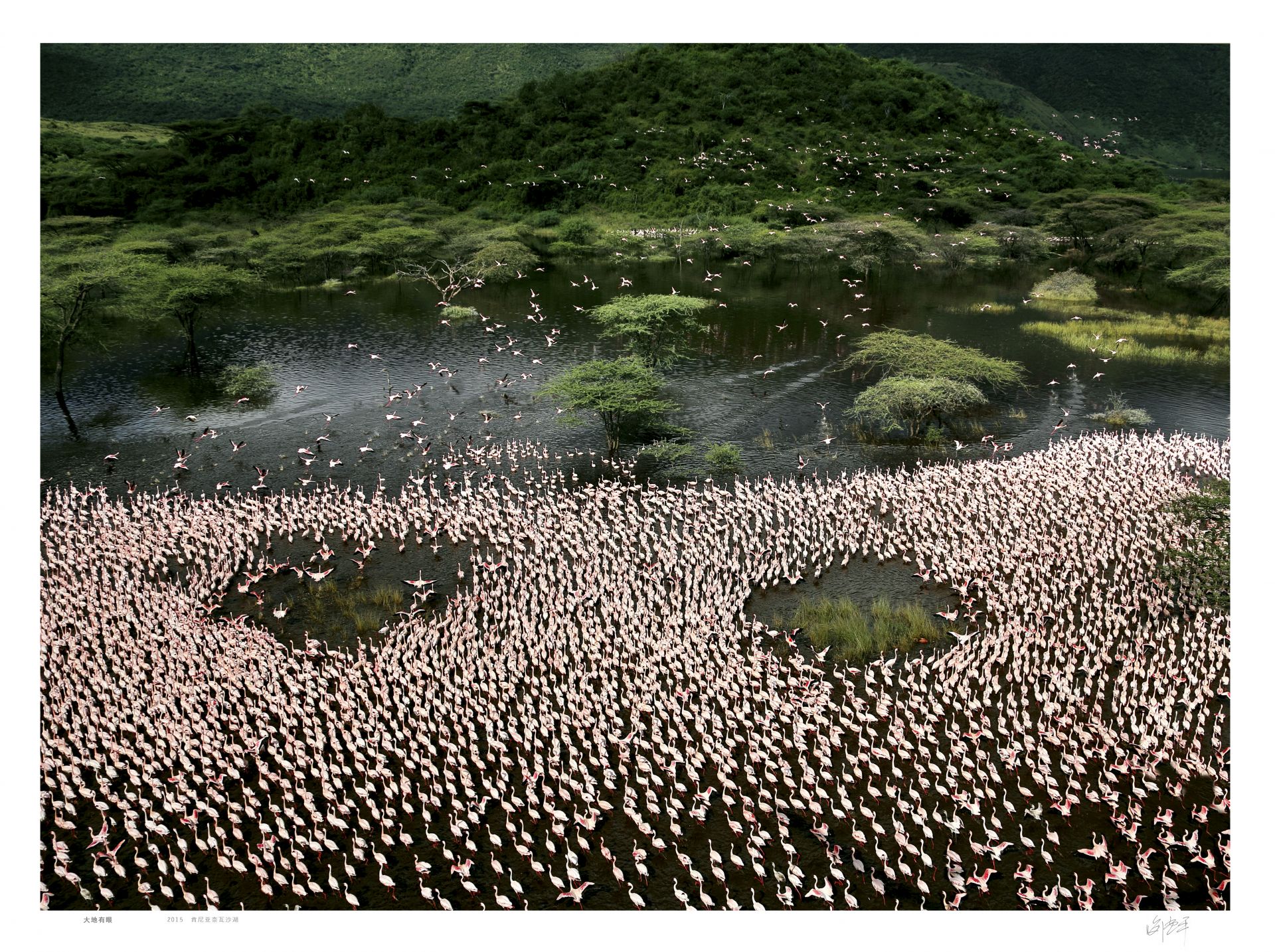 火烈鳥聚集形成流動變幻的抽象圖景,給人以想象空間.湖心小島成為火烈鳥的驛站火烈鳥的天堂:成千上萬的火烈鳥棲息在博格利亞湖,這里是它們的天堂,它們聚集在一起,漫步覓食,自由飛翔,好似一場隆重的聚會。