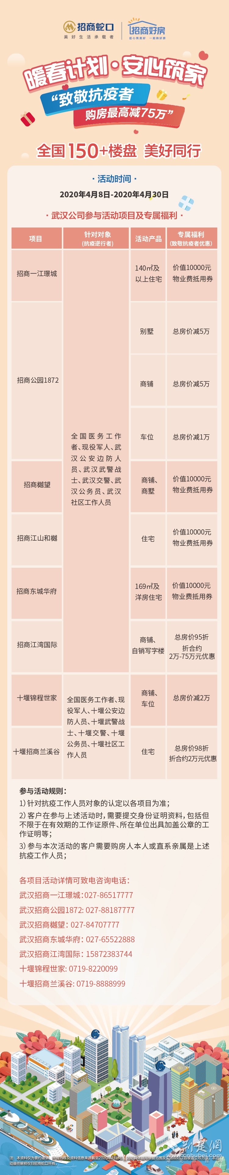 在這個特殊的日子,招商蛇口為一線抗疫人員奉上一份特殊的謝禮:4月8日至4月30日,招商蛇口推出“暖春計劃 安心筑家”活動,全國150多個樓盤,以專屬權益為一線抗疫者致以最誠摯敬意。