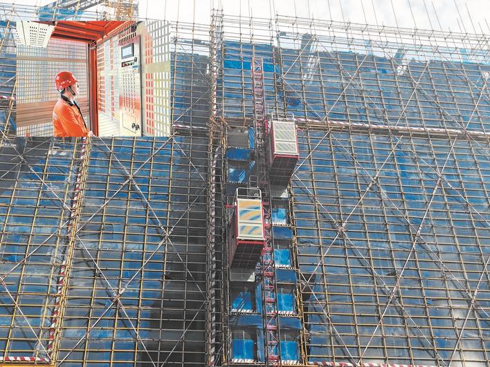讓人眼前一亮的是,工地現場在8月初創新引用了4臺無人智能升降機,實現施工人員與小型建材的垂直高效運輸,有效節省了上下樓時間。