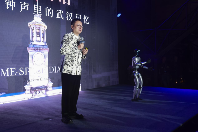 是夜,江漢關(guān)鐘聲悠揚(yáng),仿佛帶領(lǐng)現(xiàn)場百余名嘉賓穿越百年煙云。隨著《我的祖國》的音樂響起,活動在一場由著名主持人田野、“宇樹G1”機(jī)器人帶來的“歷史·現(xiàn)在·未來”時(shí)空對話中拉開帷幕。對話從人文視角深度探討了城市在傳承中煥新、在共生中前行的發(fā)展之道,思想的碰撞點(diǎn)燃了現(xiàn)場對未來城市的無限想象。田野老師在對話中講到:“歷史的車輪滾滾向前,需要記錄者,更需要思考者。百年前的江漢關(guān)前熙攘的人流,他們懷揣夢想,從這里走向世界,也讓世界走進(jìn)武漢。”