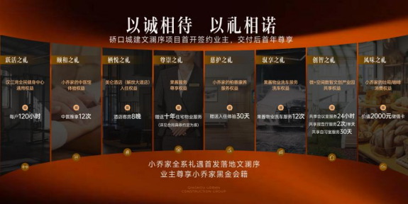小喬家黑金會籍權(quán)益包含八大權(quán)益禮,其中最為重磅的是為文瀾序項(xiàng)目首開業(yè)主贈送十年住宅物業(yè)服務(wù),是武漢首次有房地產(chǎn)企業(yè)為項(xiàng)目業(yè)主提供這么“硬核”權(quán)益。