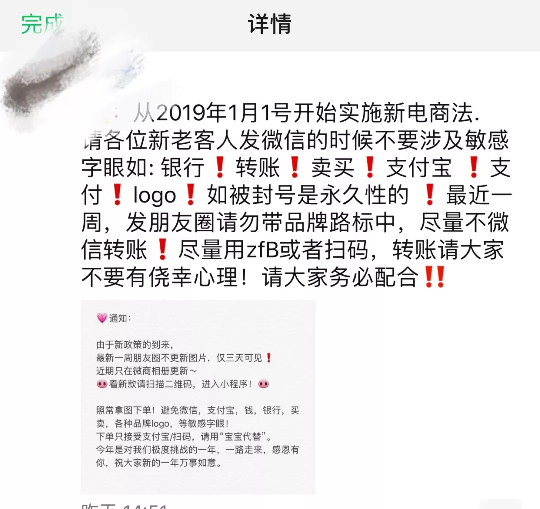 新《電商法》雖然沒有對(duì)微商、個(gè)人代購的監(jiān)管沒有出具體細(xì)則,代購圈內(nèi)卻已流傳了多個(gè)監(jiān)管措施版本,比如“敏感字眼交易雙方封號(hào)”、“不能微信直接付款”、“朋友圈限流和降權(quán)”等。