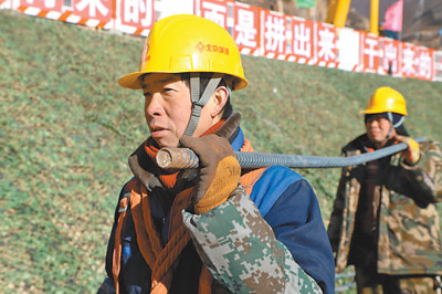 “砰砰砰,砰砰砰……”地下幽深的抗滑樁井道內(nèi),3名工人正操作著風(fēng)鎬……張健在準確測量抗滑樁深度的同時,提醒工友們注意施工安全。狹窄的通道上,工友們邁著穩(wěn)穩(wěn)的步子,推著裝滿碎石的小推車向滑道走去。寒風(fēng)吹拂下,體表溫度降至零下12攝氏度,工友們的汗水卻一滴滴滑落……