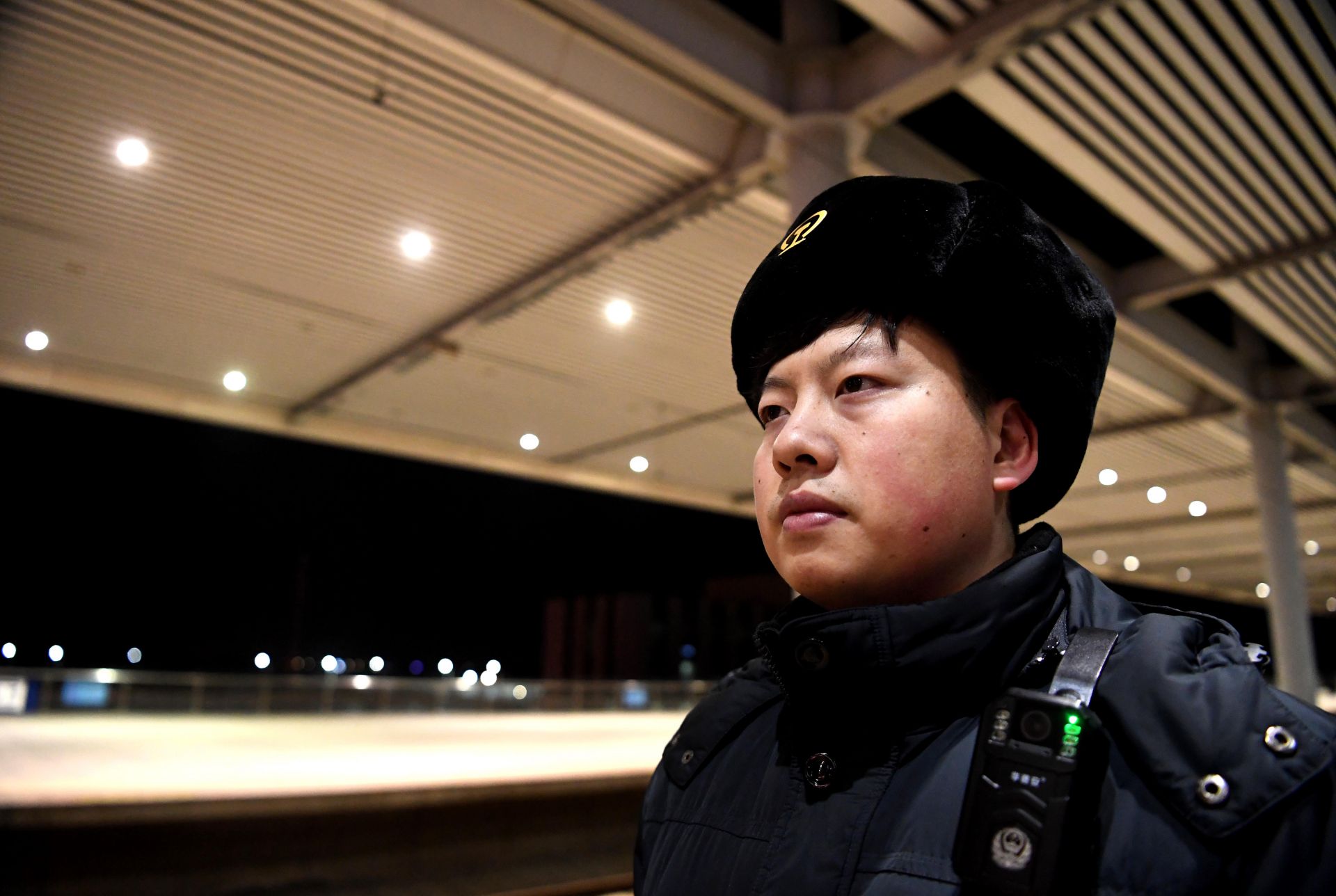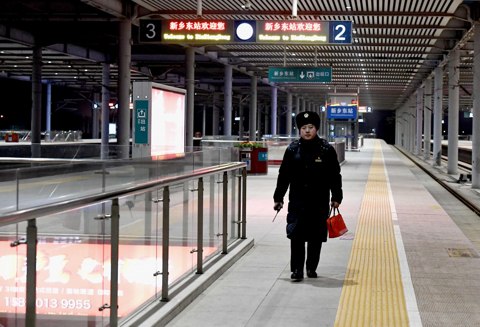 1月22日,李翔在新鄉東站站臺上立崗進行G402次列車進站接車作業。