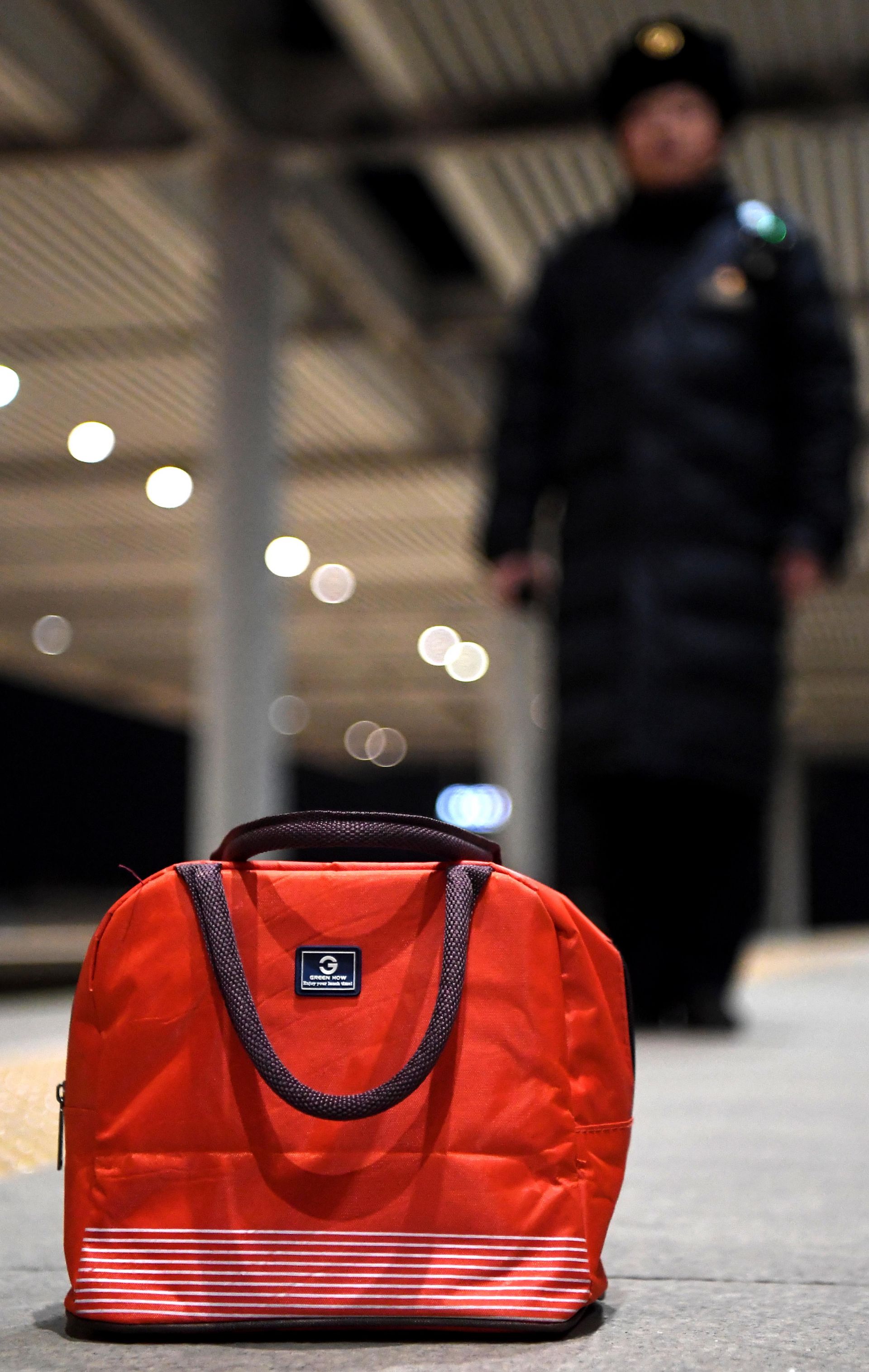 1月22日,李翔在站臺上立崗等候接車,旁邊放著他為妻子鄒小娟準備的晚餐餐包。