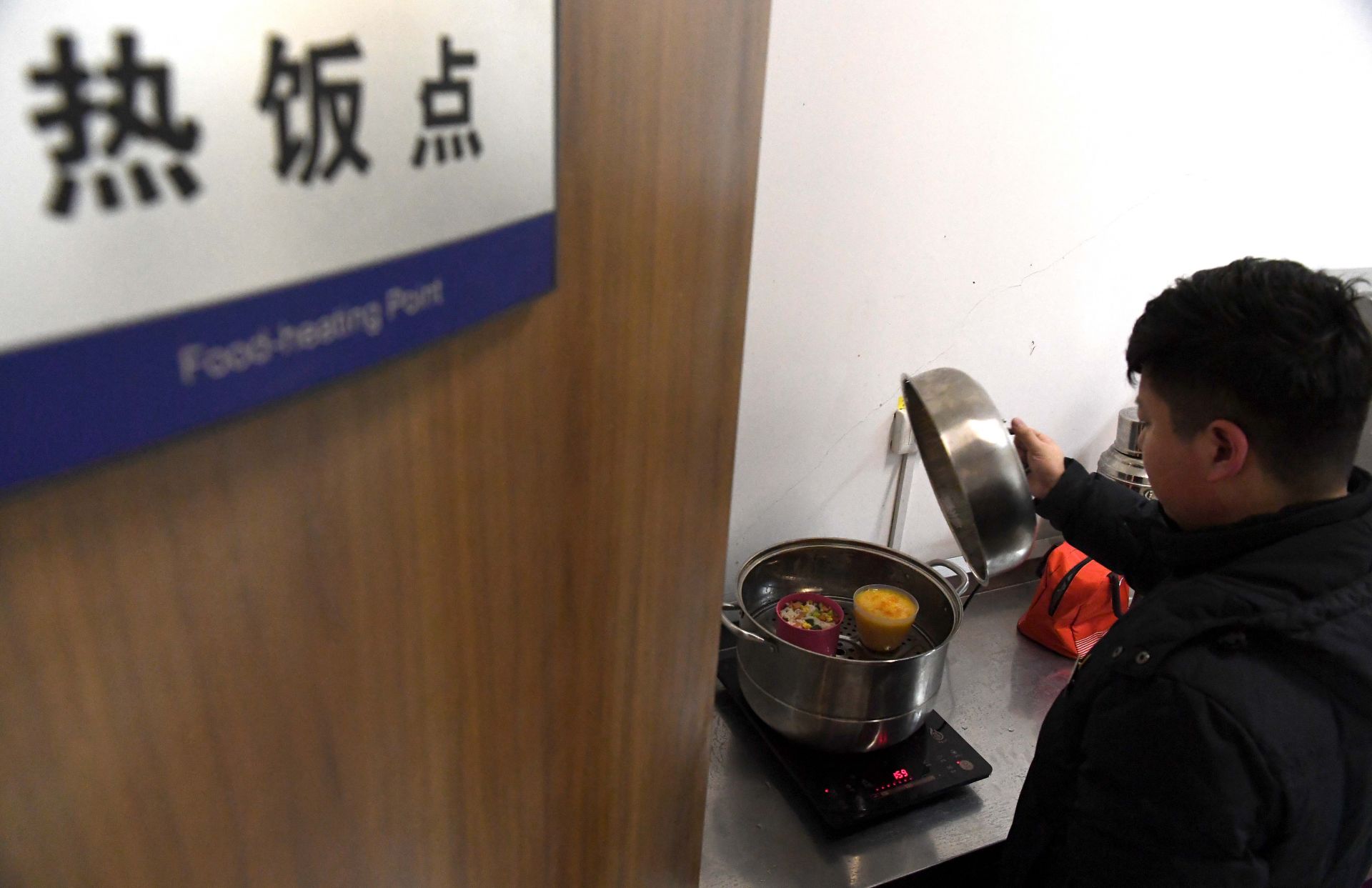 1月22日,李翔在新鄉東站熱飯點為妻子加熱晚餐。