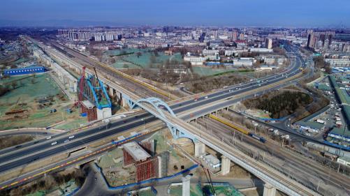 位于北京黃村的建設(shè)中的京雄城際鐵路(2019年1月5日無人機(jī)拍攝)。