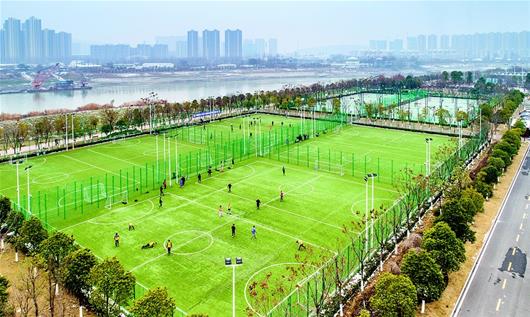1月2日,市民在武漢硚口區漢江江灘體育公園的運動場里踢足球。硚口漢江江灘公園設計為“項鏈串珍珠”景觀,位于漢江北岸硚口段,全長約15公里。通過近幾年防洪與環境綜合整治,游泳池、運動場等都已投入使用,觀景平臺、生態綠道已成為市民休閑的好去處,被譽為“醉美漢江灣”的公園,今年將全面建成開放。