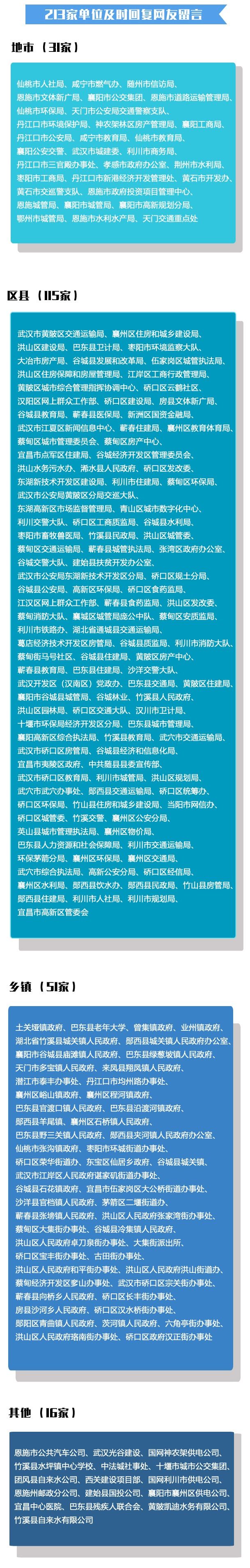 還有1960多家單位與荊楚網(wǎng)《網(wǎng)絡(luò)問(wèn)政—民生熱線》欄目組密切合作,及時(shí)回復(fù)網(wǎng)友留言,響應(yīng)群眾關(guān)切,欄目組代表廣大網(wǎng)友表示誠(chéng)摯感謝!同時(shí),因各種原因,還有部分留言沒(méi)有得到及時(shí)回復(fù),如有回音,請(qǐng)?jiān)凇毒W(wǎng)絡(luò)問(wèn)政—民生熱線》中及時(shí)給予回復(fù)。屆時(shí),荊楚網(wǎng)《網(wǎng)絡(luò)問(wèn)政·民生熱線》欄目將推出2018年度問(wèn)政報(bào)告,統(tǒng)計(jì)2018全年單位回復(fù)情況,敬請(qǐng)關(guān)注。