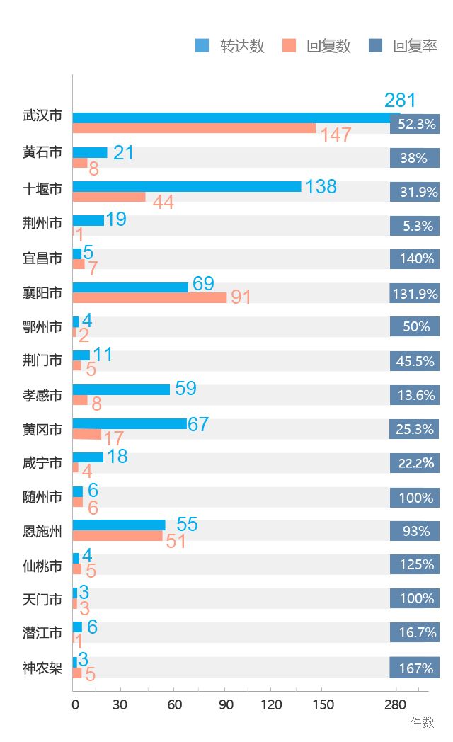 武漢市:轉(zhuǎn)達(dá)(45+236=281條),已回復(fù)147條,回復(fù)率52.3%。