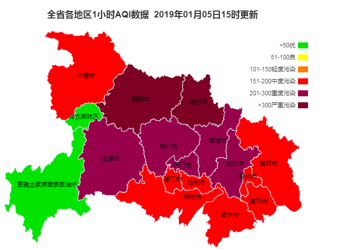 據(jù)湖北省生態(tài)環(huán)境廳網(wǎng)站的AQI實(shí)時(shí)數(shù)據(jù)顯示,截至1月5日下午3點(diǎn),湖北襄陽(yáng)、隨州兩地空氣質(zhì)量指數(shù)破300,達(dá)到嚴(yán)重污染級(jí)別;武漢、宜昌、荊門、孝感、天門等5地空氣質(zhì)量達(dá)到重度污染級(jí)別。全省僅神農(nóng)架和恩施兩地尚未被“霧霾”侵襲。據(jù)@武漢氣象:未來(lái)72個(gè)小時(shí)內(nèi),空氣質(zhì)量不會(huì)有明顯改善。提醒:兒童、老年人及心臟病、肺病患者應(yīng)停留在室內(nèi),停止戶外運(yùn)動(dòng),一般人群減少戶外運(yùn)動(dòng)。