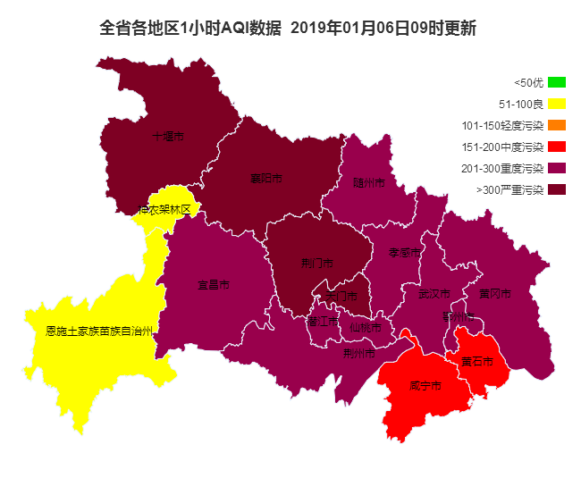 據湖北省生態環境廳網站的AQI實時數據顯示,截至1月6日上午9時,湖北襄陽、十堰、荊門、天門等4地空氣質量指數破300,達到嚴重污染級別;武漢、宜昌、孝感、鄂州、黃岡、仙桃、潛江、荊州、隨州等9地空氣質量達到重度污染級別。全省僅神農架和恩施兩地尚未被“霧霾”侵襲。